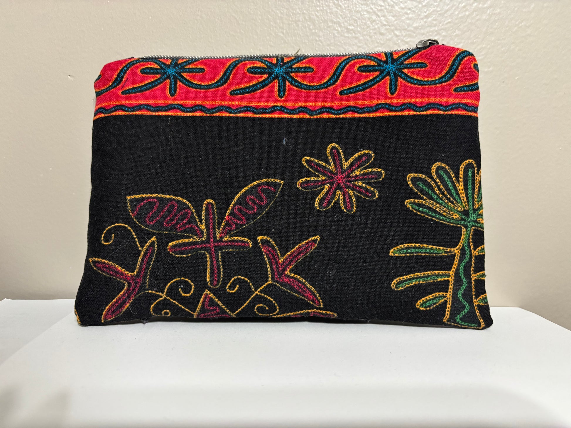 Built from repurposed black denim and complemented by striking tribal-patterned fabric, this wristlet balances understated elegance with bold artistic expression. The classic denim foundation offers reliable durability, while the colorful tribal accent introduces cultural richness and visual depth. A thoughtfully designed piece that demonstrates how upcycled materials can yield sophisticated, conversation-starting accessories with genuine substance.